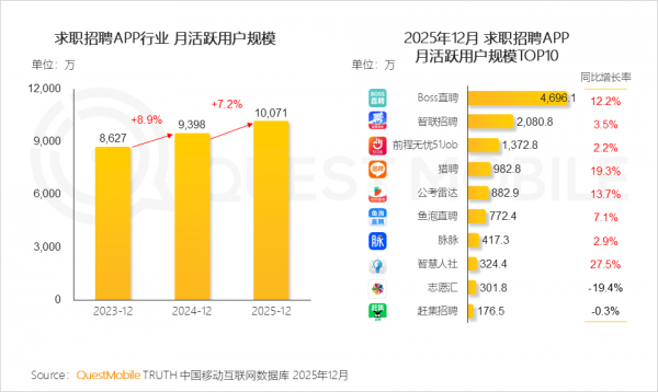 数据可以说明一切。数据显示,截至2025年12月31日,BOSS直聘累计服务超过2.5亿求职者,服务企业总数超过2000万家。QuestMobile数据显示,2025年12月,BOSS直聘APP月活跃用户规模同比增长12.2%,不仅同比增幅远高于同行,用户总量也很大——基本上是第二名、第三名和第四名月活的总和。