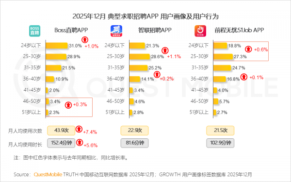 换句话说,这是“深度使用”而非“随便看看”。更关键的是,同样的宏观环境下,BOSS直聘的增长也超过其他招聘平台——大盘影响很重要,但产品力才是决定性因素。
