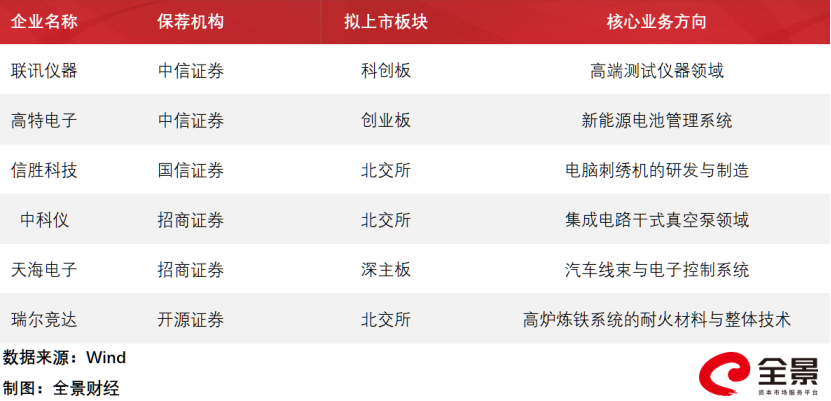 六家企业均聘请知名中介机构提供服务,保荐机构包含中信证券、国信证券、招商证券、开源证券;审计机构包括容诚、天健、立信、信永中和;法律顾问涵盖德恒、中伦、天册、大成等头部律所。