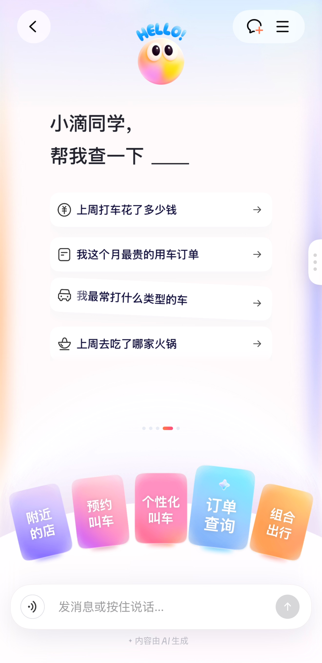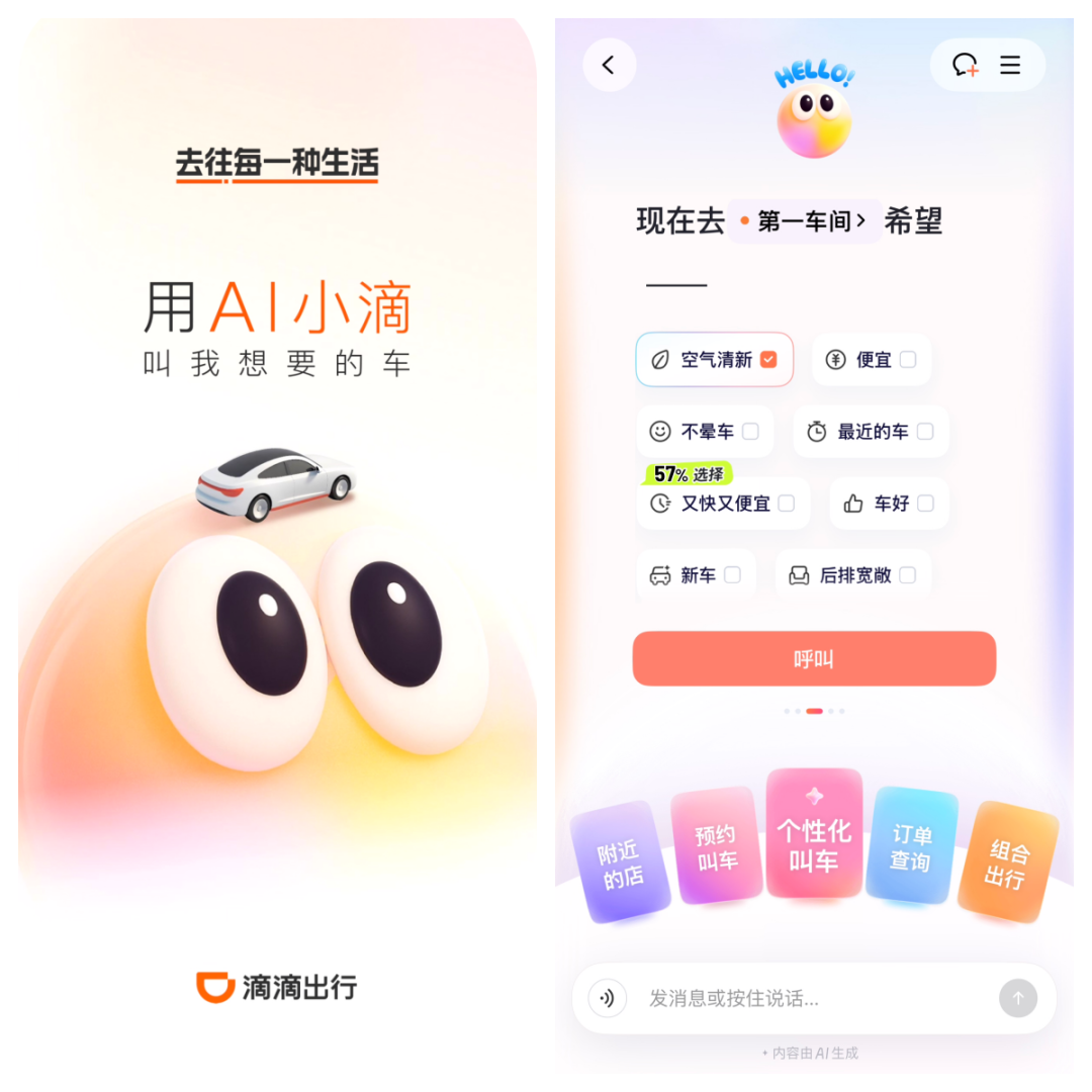 最近,滴滴正式上线了AI出行助手“小滴”。在滴滴App首页点击“AI叫车”,原本需要输入地址、勾选车型、比对价格的繁琐步骤,被简化成一个极简的对话框。