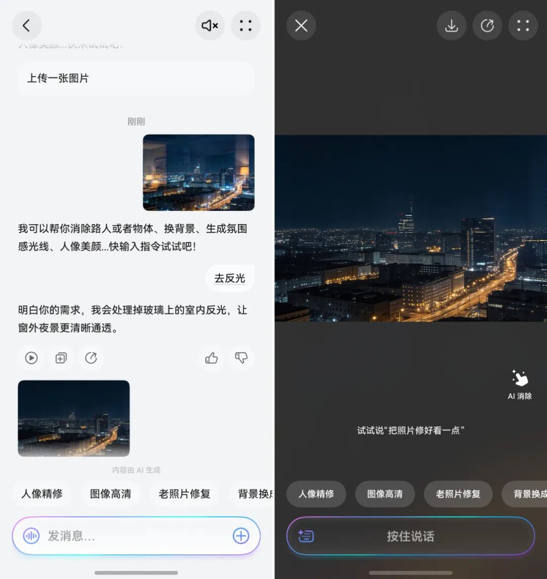 除了扩图、消除等常见玩法,去反光这种细节能力其实更能考验AI助手修图的功底。比如想要p掉从窗户拍夜景时的反光,其他AI助手要么不具备此功能,要么有反光残留处理得不够自然,而小艺可以把反光去得干净、完整,真正意义上的拯救“废片”。可以说,小白和百万修图大师中间,只差了一个小艺。