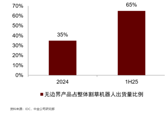 目前,无边界产品在市场上的占比正快速提升。数据显示,其占比已从2024年的35%升至2025上半年的65%。按出货量看,全球无边界的割草机器人出货量预计将从2024年的38.4万台,增长至2029年的339.7万台,期间年均复合增长率高达约54.7%。我国割草机出口额快速增长,割草机占全球份额约30%-40%。