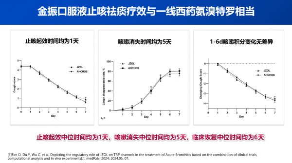 与一线西药氨溴特罗的头对头研究证实,两者疗效相当,且金振口服液在改善肺部啰音方面更优,止咳起效中位时间仅1天,临床痊愈时间6天。