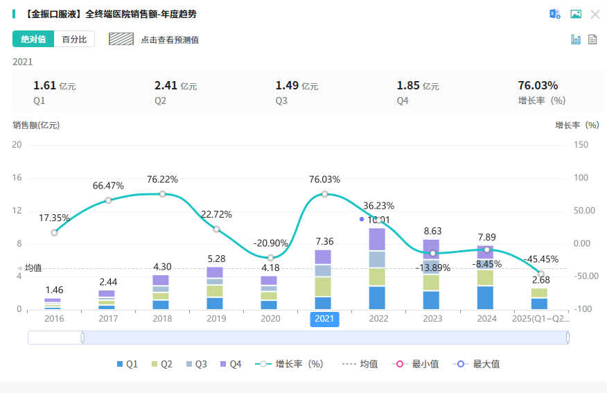 据摩熵医药数据库显示,2024年,金振口服液在全终端院内销售额达7.89亿元,持续领跑儿科中成药市场;散寒化湿颗粒销售额突破230万元,同比大幅增长370.24%,展现出强劲的增长势头与市场潜力。
