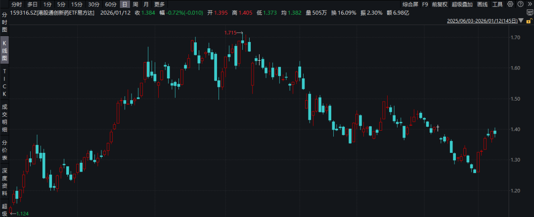 那么,从创新药的位置上看,其实整体板块已经回到了去年7月份时的水平,已经有充分的调整了,接下来随着降息预期升温,中国创新药企的BD交易催化下,创新药仍然是上半年值得关注的行业,可适当关注下港股通创新药ETF易方达(159316)。