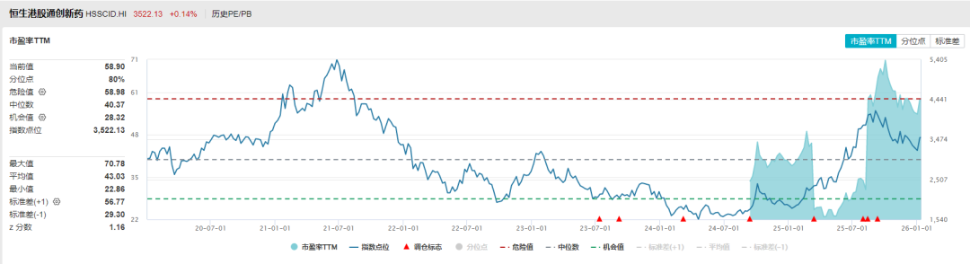 从下图中看,恒生港股通创新药的分位数在80%,目前的静态估值相较2025年9月份时便宜了不少,指数的静态估值情况也没有达到21年的顶峰水平。