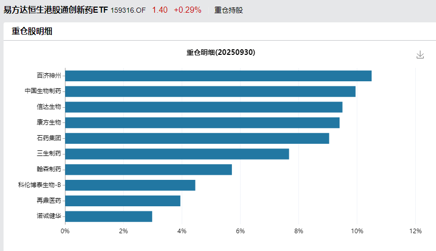 例如港股通创新药ETF易方达(159316)是不错的选择,重仓股以创新药龙头为主。未来BD交易有望更频繁,金额也可能更大,龙头公司平台化优势更明显。场外的朋友也可关注联接基金(A/C:024328/024329)。
