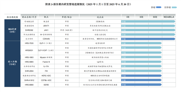 在持续高强度的研发投入支撑下,恒瑞医药管线产品进度不断推进。据恒瑞医药2025年半年报显示,恒瑞医药(含报表内子公司)6 款 1 类创新药获批上市,6 个新适应症获批上市。与此同时,共有 5 项上市申请获 NMPA 受理,10 项临床推进至Ⅲ期,22 项临床推进至Ⅱ期,15项创新产品首次推进至临床Ⅰ期。此外,项目注册申报工作有序推进。报告期内,公司取得创新药制剂生产批件 12 个;取得创新药临床批件 62 个;2 项临床试验被纳入突破性治疗品种名单。