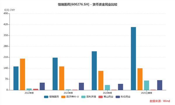 行业领先的盈利能力给恒瑞医药带来的最直接体现就是货币资金逐年增加。2025年前三季度,恒瑞医药的货币资金来到403.6亿元。同比增长82.39%。这些大量流动资金的存在给恒瑞医药的高研发提供了较厚的安全垫和确定性。