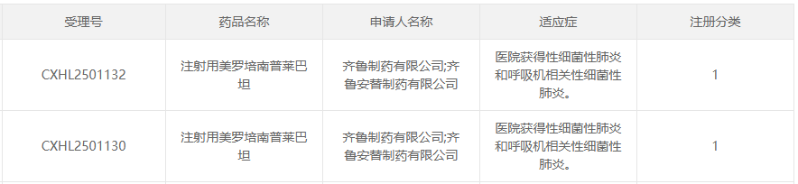 齐鲁制药的 注射用美罗培南普莱巴坦 在研发进程中稳步推进、成果斐然。2024年6月13日,其首次临床申请获CDE正式承办;同年9月2日,顺利获批开展临床试验;仅隔3日,即9月5日,便正式步入Ⅲ期临床试验阶段,聚焦于细菌性感染及腹部脓肿相关治疗。2025年12月19日,该药物新适应症临床试验申请再获默示许可,此次拟开展的临床试验针对医院获得性细菌性肺炎和呼吸机相关性细菌性肺炎。