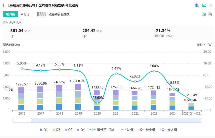 注射用美罗培南普莱巴坦 是一款复方抗感染新药,由碳青霉烯类抗生素美罗培南与β -内酰胺酶抑制剂普莱巴坦组成。该药适用于复杂性腹腔感染等病症的治疗,尤其对碳青霉烯耐药肠杆菌科细菌等耐药菌感染具有针对性。据摩熵医药数据库显示,2024年系统用抗感染药物(化药或生物药)在全终端院内市场的销售总额超过1500亿元,市场潜力巨大。注射用美罗培南 在院内市场脱颖而出,强势位列TOP10榜单,稳稳占据市场关键一席!