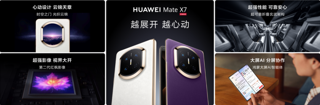 产品层面,华为折叠屏美学工艺再谱新篇,时空之门的设计语言和非遗云锦传统工艺的创新融入使华为Mate X7辨识度拉满,搭配超可靠的折叠玄武架构,既赏心悦目,又安心可靠。同时,基于软硬协同创新,焕新设计、全面可靠、强大影像、智慧体验等整机表现抬升到史无前例的新高,问鼎行业集大成之作。