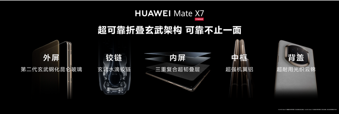 例如折叠特殊形态导致的可靠性难题,华为折叠屏从机身材料、结构、工艺等切入,对华为Mate X7核心部件全副武装,确保日常使用安全可靠。外屏的第二代玄武钢化昆仑玻璃、内屏超韧三重叠层结构、全新玄武水滴铰链、超强机翼铝中框,四大升级协同构筑系统化可靠防护。非遗云锦工艺的后盖也是美学与耐用性兼具。