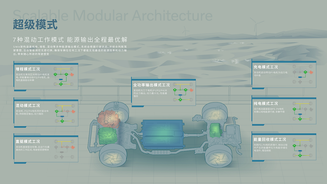 其二,系统可智能调配“1.5T混动专用发动机 + P1/P2/P4三电机”的动力输出,形成四擎四驱。在面临如高速超车、湿滑路面时,可瞬间爆发出媲美高性能燃油车的综合马力;在日常巡航时,则自动选择最经济的工作模式,将每一份能量用到极致。