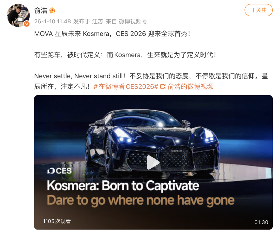 更关键的是,追觅科技创始人俞浩,在自己的微博上直接为星辰未来站台。他写下“有些跑车,被时代定义;而Kosmera,生来就是为了定义时代”这样的话。言语间的自信,藏不住对这个品牌的掌控力。