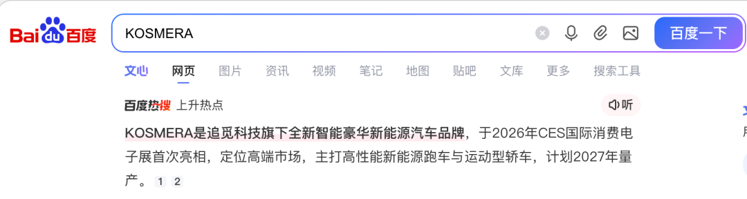 据百度搜索结果显示“KOSMERA是追觅科技旗下全新智能豪华新能源汽车品牌”。