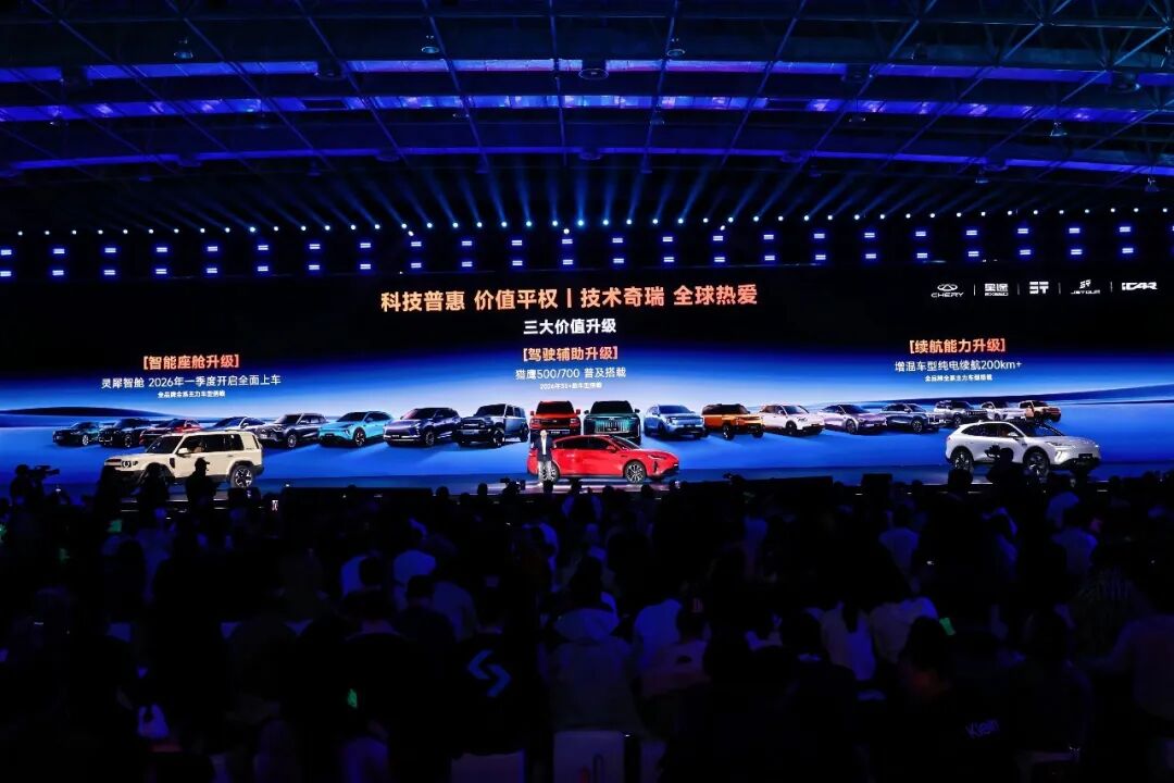 同时,奇瑞公布了三大升级计划:灵犀智舱计划在2026年一季度实现全品牌全系主力车型全面上车;猎鹰智驾在2026年将有超35款车型搭载;增混车型实现200km+的纯电续航。
