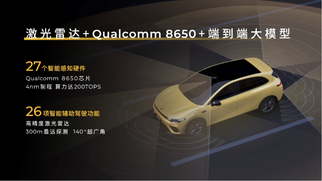 智能驾驶方面,零跑Lafa5 Max版车型搭载含激光雷达在内27个高精度感知硬件,基于高通8650芯片,做到了端到端辅助驾驶。