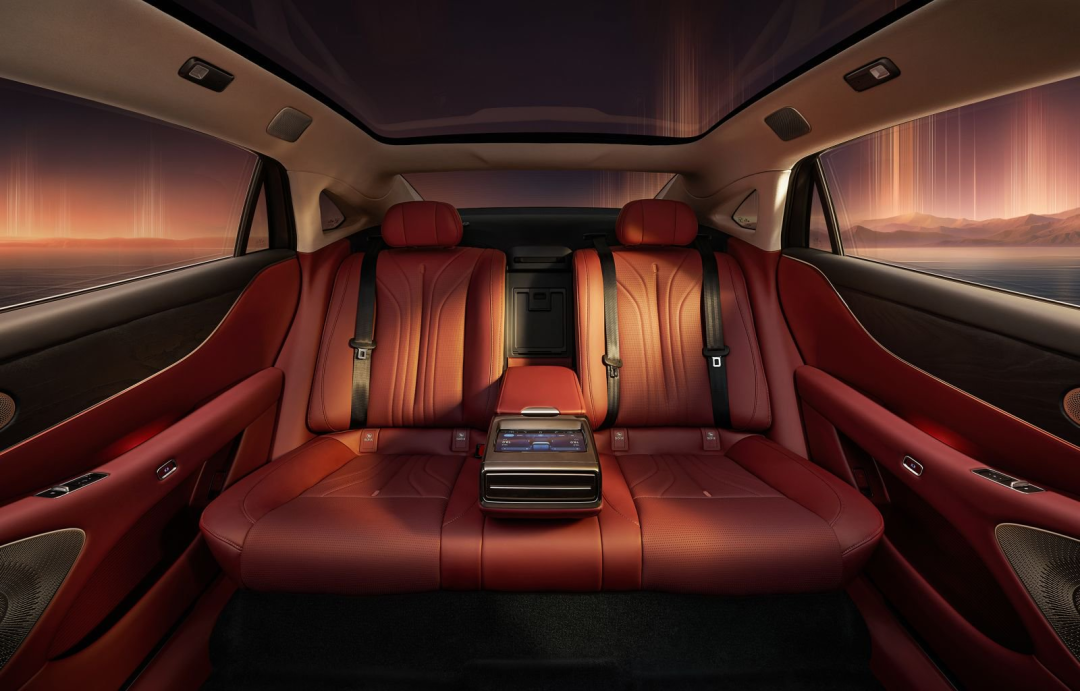 进入车内,像10.25英寸全液晶仪表、16.1英寸的大屏、6.6升冷暖压缩机冰箱、前排50瓦手机无线充电、四温区自动空调、香氛系统、方向盘加热、前后排双隔音玻璃等一应俱全。