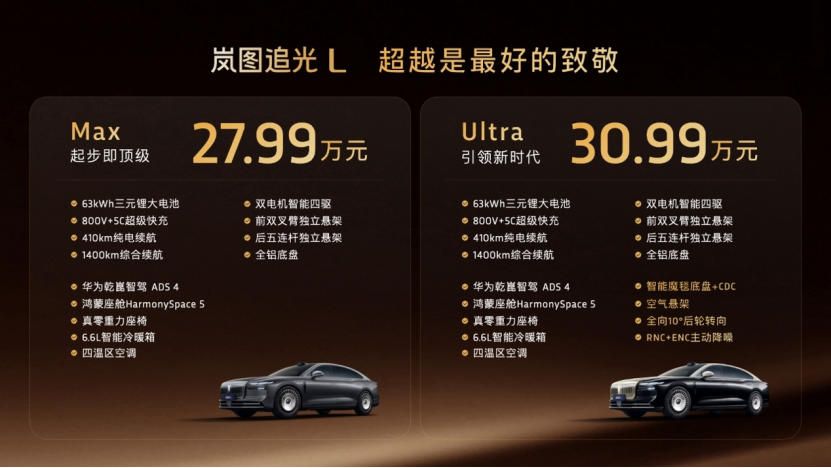 12月10日,在主题为“破晓”的上市发布会上,岚图汽车年度压轴力作追光L正式登场。新车共推出2个配置版型,指导价分别为27.99万元与30.99万元。作为一款中大型豪华新能源轿车,追光L所定价格,直接对标传统豪华品牌的燃油与插混轿车主力车型。