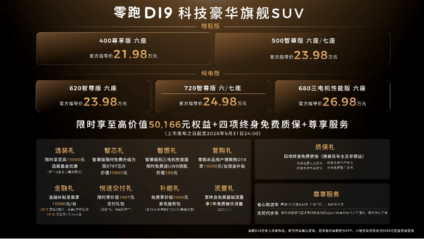 4月16日,零跑旗下旗舰D平台首款车型——D19正式上市,共推出增程与纯电两种动力形式、六座与七座多种版本,官方指导价区间为21.98-26.98万元。