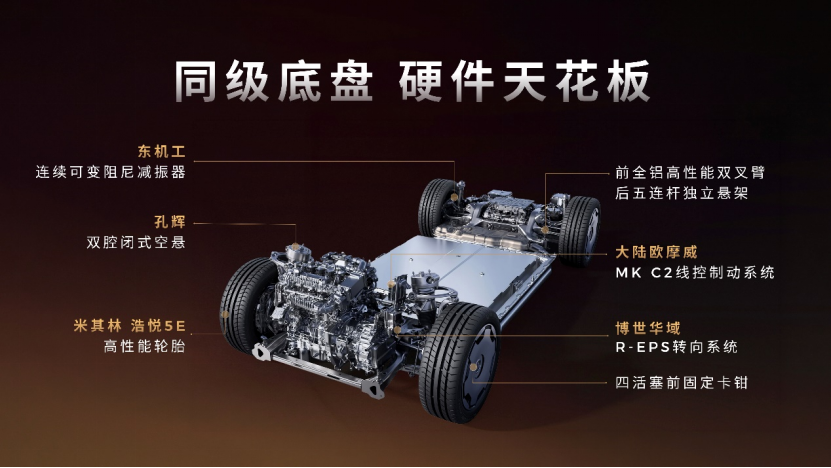 驾控与安全同样配置丰富。纯电版三电机四驱实现3秒级零百加速,搭载孔辉双腔闭式空气悬架、东机工连续可变阻尼减振器、博世华域R-EPS转向等“一身名牌”。车身采用九横三纵四强环笼式设计,16处应用2000Mpa热成型钢,同级领先9气囊配置。