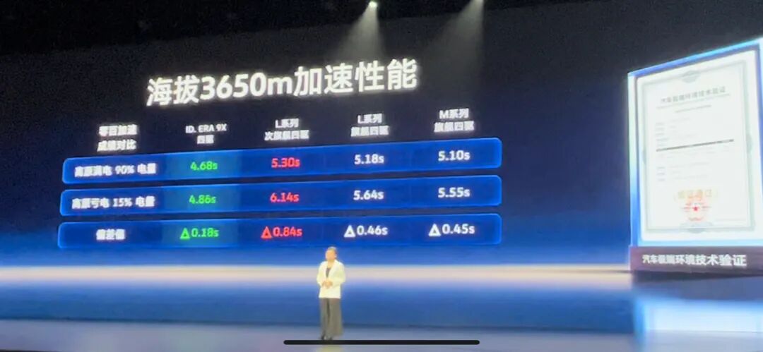 其次是性能上的表现。影响增程的使用体验,还有噪音和馈电时候的性能表现,此前有增程车在高速行驶中,因为电量耗尽而引发动力短暂缺失,影响行车安全。而上汽大众的这款增程器则在这些痛点上进行了针对性的解决,比如在增程器介入时候的噪音低于0.5分贝。在-30°极寒工况下高低电量加速相差0.8s,其中电量90%的时候加速用时5.51s,而电量20%的时候加速需要6.31s。除了极寒,还有一个极端工况是高海拔地区,而在海拔3650m的地区,上汽大众9X加速性能差值为0.18s,表现远好于友商的L系列和M系列。