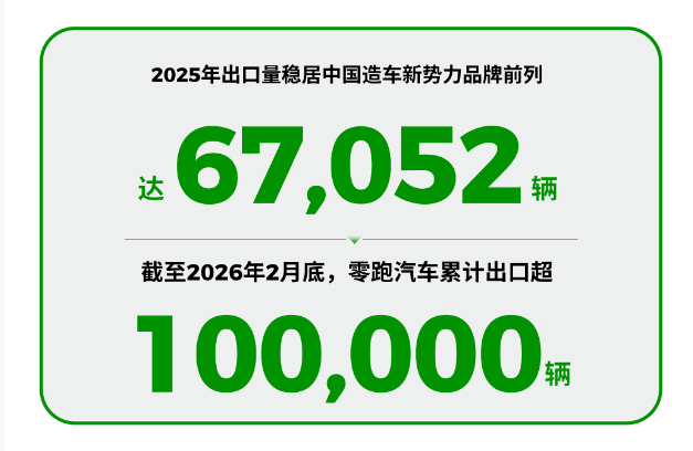 2025年,零跑在海外市场的布局已经初见成效,全年出口67052台汽车,是造车新势力中出口量最高的,2026年,海外仍是零跑的重要增量。