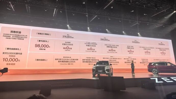 极氪高管在发布会后表示,在2万个预售订单中,高配Ultra版本占大多数。需要花2.5万元选配的千里浩瀚H9是最大的卡点,预计要到7月才能交付。为了避免出现极氪9X下定后等待太久的情况,顶配曜影版虽标配的是千里浩瀚H9,但可以选择装H7,这样既可以快点交付,车价也能立减2.5万。此外,极氪计划根据预售的订单情况,提前准备1000多台的甄选版本,可在上市后迅速提车。