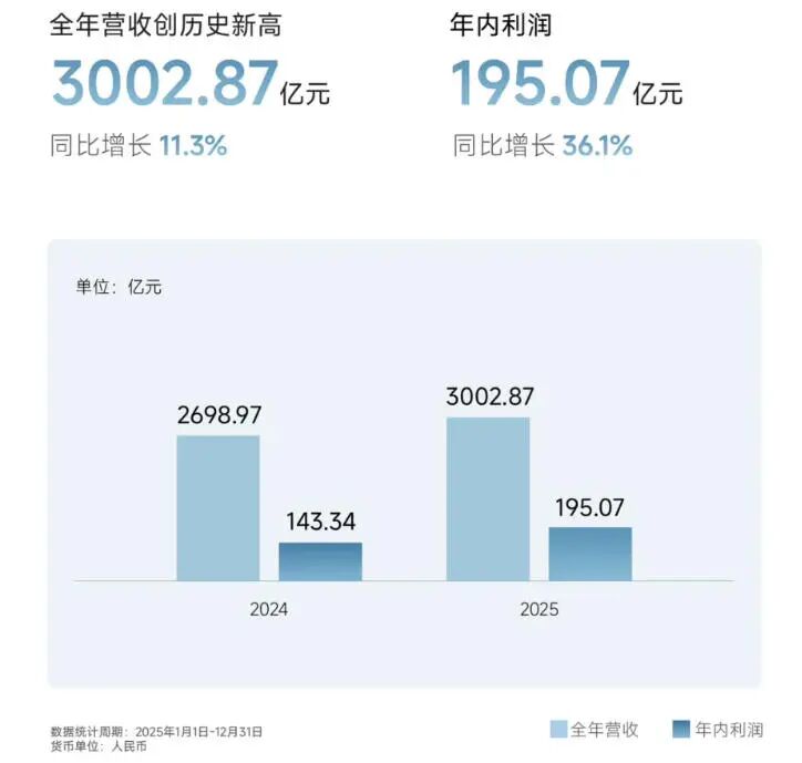 很多人看车企发布会,最怕的就是PPT造势,没实打实的家底支撑。奇瑞这次反着来,先亮成绩单,再讲技术,底气足得很。这份上市首份年报,核心数据全是硬货:2025年总营收首破3000亿元,同比增长11.3%;净利润195.1亿元,同比大涨36.1%,增速远超销量,净利润率也从5.3%提升至6.5%,是真正的规模与质量双增长。