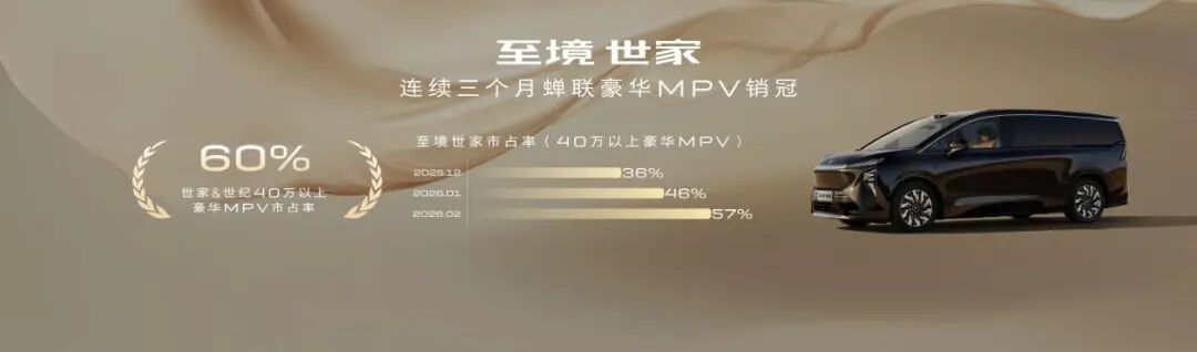 先看一组数据。至境世家插混版上市三个月,连续拿下40万以上豪华MPV销冠。市占率从36%一路涨到57%,和别克世纪一起,在这个价格段占了60%的份额——相当于每卖出5辆40万以上的豪华MPV,就有3辆来自别克。
