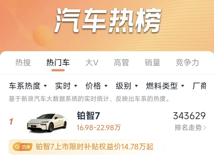 发布不到2小时,铂智7热度飙升至新浪汽车热榜第一,甚至盖过了小米SU7的风头。截止至3月29日晚上21:14分,大定已达3179辆。