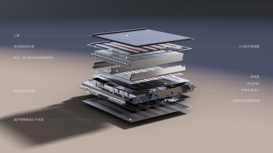 电池底部使用超强特种钢与 FD 高分子防爆耐磨涂层组合,对地形能力的适应性更好,根据官方数据,其撕裂强度为常规 PVC 的 10 倍,冲击强度达到国标的 7 倍,防盐雾周期可达 20 年。