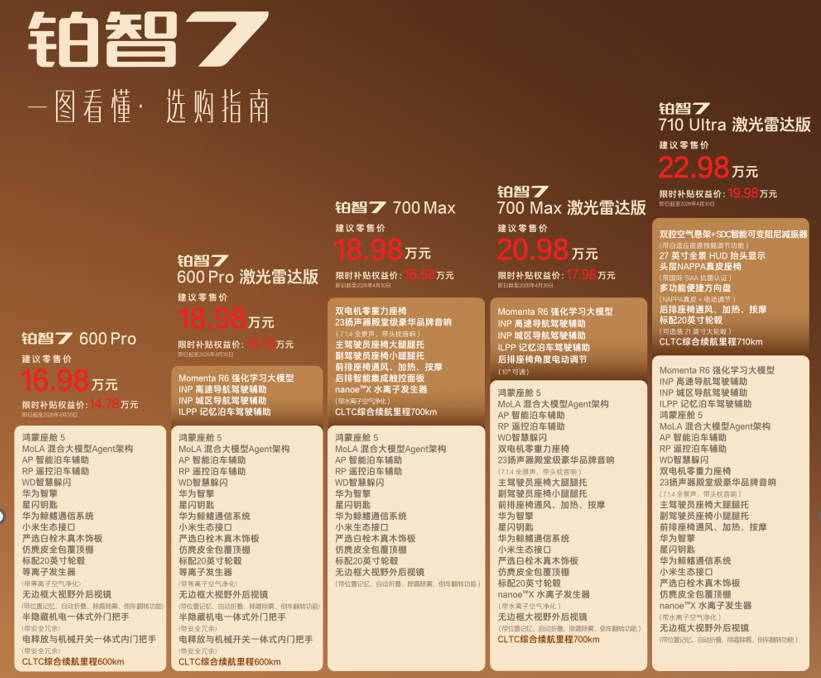 这两个数字本身并不惊天动地。这个价格带,比亚迪汉EV、小鹏P7+、特斯拉Model 3早已激战多年。真正让行业侧目的,是这组数字背后的配置清单:5.13米车长、3.02米轴距,D级车的尺寸;全系标配华为鸿蒙座舱5.0;600 Pro激光雷达版16.18万元,700 Max激光雷达双腔空悬版17.98万元;顶配710 Ultra激光雷达版19.98万元,一次配齐华为鸿蒙座舱、Momenta R6激光雷达智驾、双腔空气悬架、Nappa真皮座椅、27英寸全景HUD。