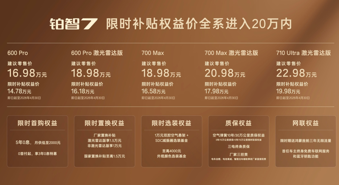 17.98万元的700 Max激光雷达双腔空悬版,一次配齐华为鸿蒙座舱、Momenta R6激光雷达智驾、双腔空气悬架三大顶级配置,20万内唯一。选装双腔空悬只需5000元,质保期叠加后达10年或30万公里,是行业平均水平的2倍。