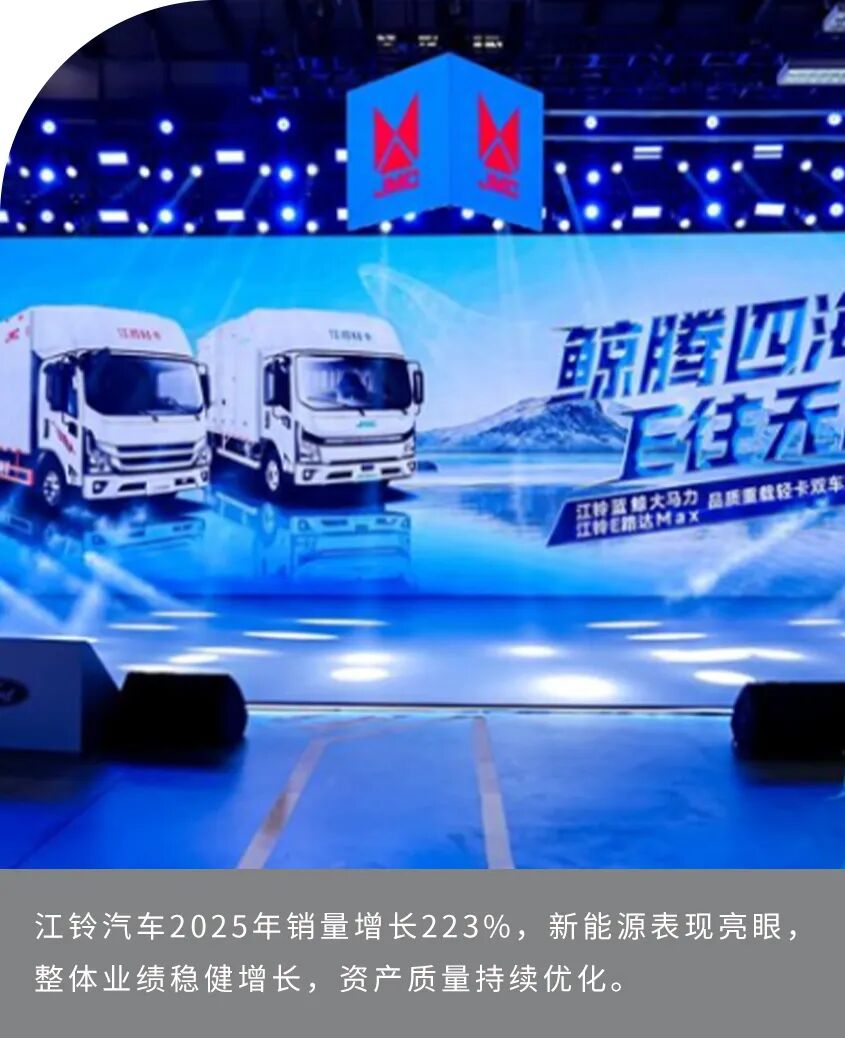 在新能源转型方面,江铃汽车成效显著。2025年新能源销量同比增长223%,并积极探索运力运营、车队管理、租售一体等全新商业模式,拓展业务边界。