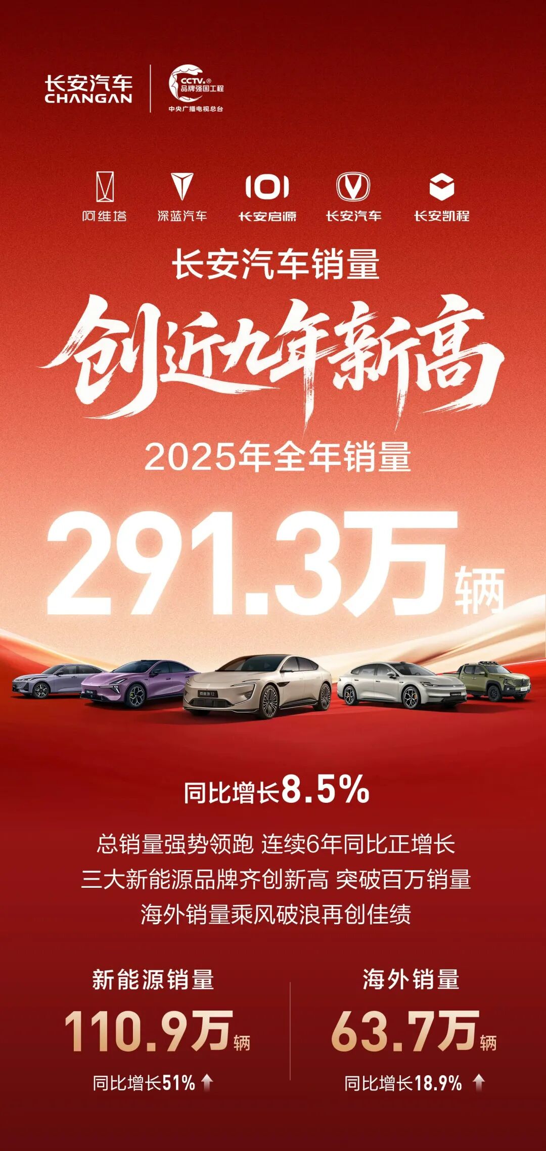 2025年,长安汽车以全年销量291.3万辆、同比增长8.5%的成绩,不仅创下近九年新高,更在新能源、海外市场、品牌矩阵与技术自立等多个维度实现系统性突破。“十四五”期间长安年均复合增长率达到7.8%,海外年复合增长率超过50%,新能源年均复合增长率更高达97.3%,并在2025年进一步突破百万大关,渗透率大幅提升。