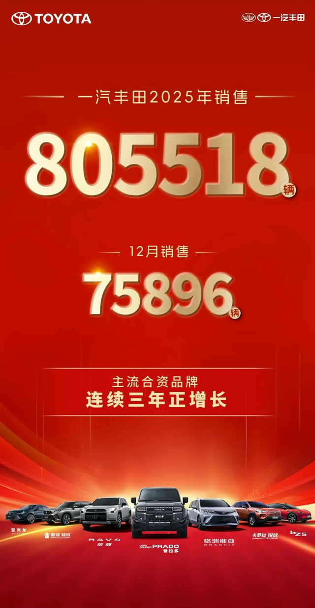 大企业搬迁意味着诸多麻烦。然而,即便经历了这样一场“大折腾”,2025年,一汽丰田在中国市场依然卖出了80.55万辆新车。这一数据意味着,在合资份额日益缩减的中国车市,一汽丰田仍做到连续三年保持销量增长。与此同时,曾有消息人士对媒体表示,一汽丰田2025年整体利润规模为73.5亿元,单车利润达到9000元,这足以说明一汽丰田仍保持着良好的经营效益。