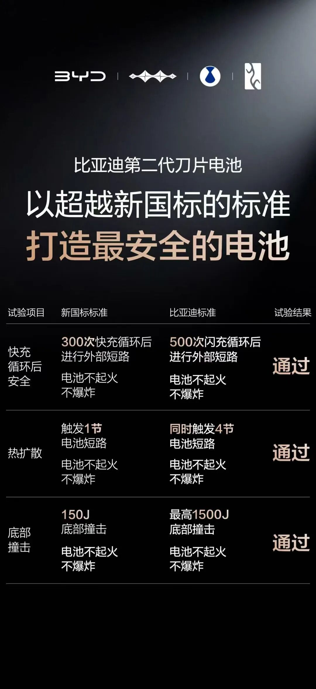 从第一代刀片电池树立安全标杆,到第二代刀片电池定义闪充标准,比亚迪用六年时间,完成了从“技术跟跑”到“标准制定”的跨越。如今,第二代刀片电池的安全标准远超新国标:500次闪充循环后,边闪充边针刺仍无烟无明火;同时触发4节电池短路,也不会热失控;10倍新国标的底部撞击测试,轻松过关。