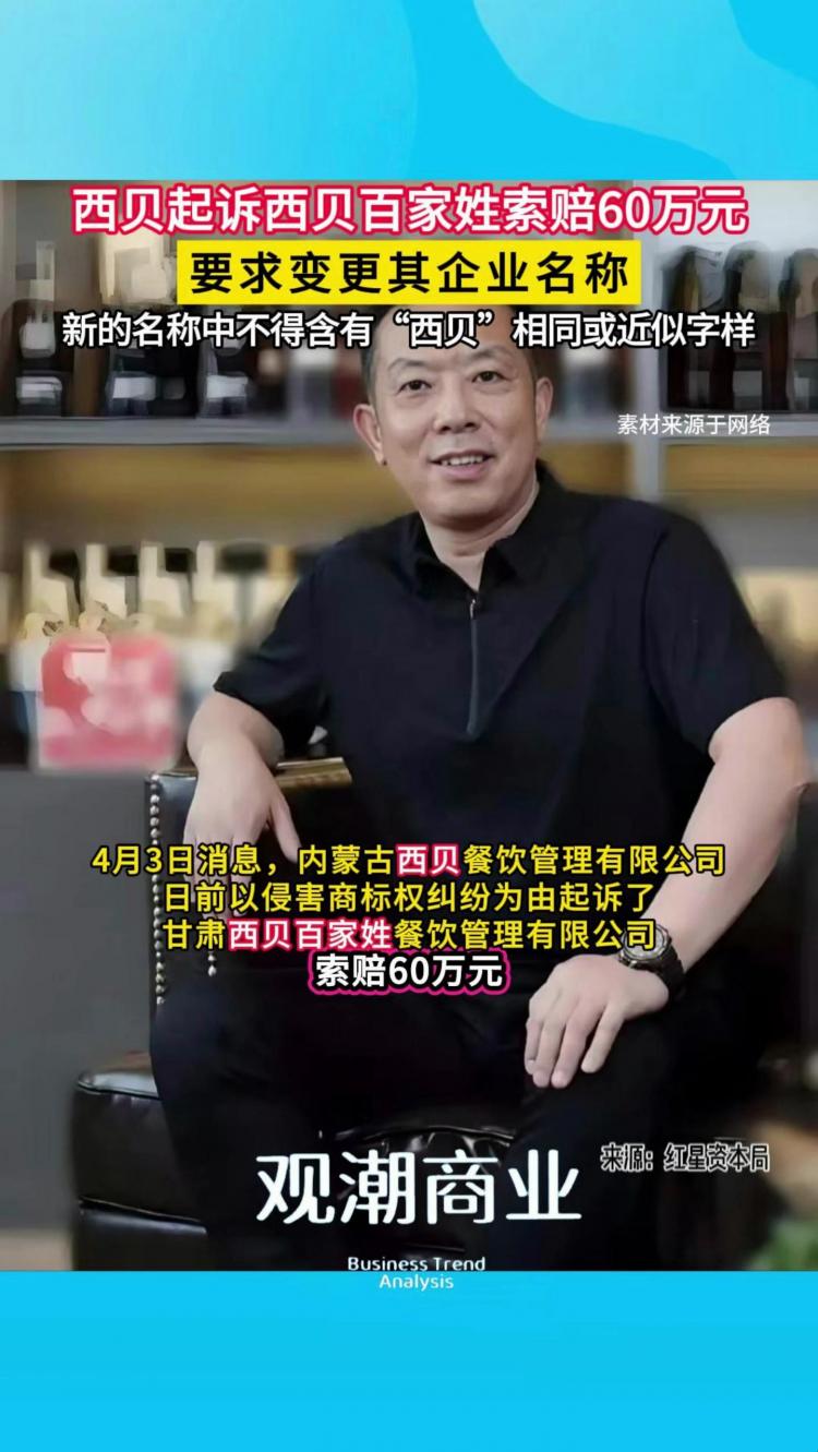 西贝起诉西贝百家姓索赔60万元,要求变更其企业名称,新的名称中不得含有“西贝”相同或近似字样