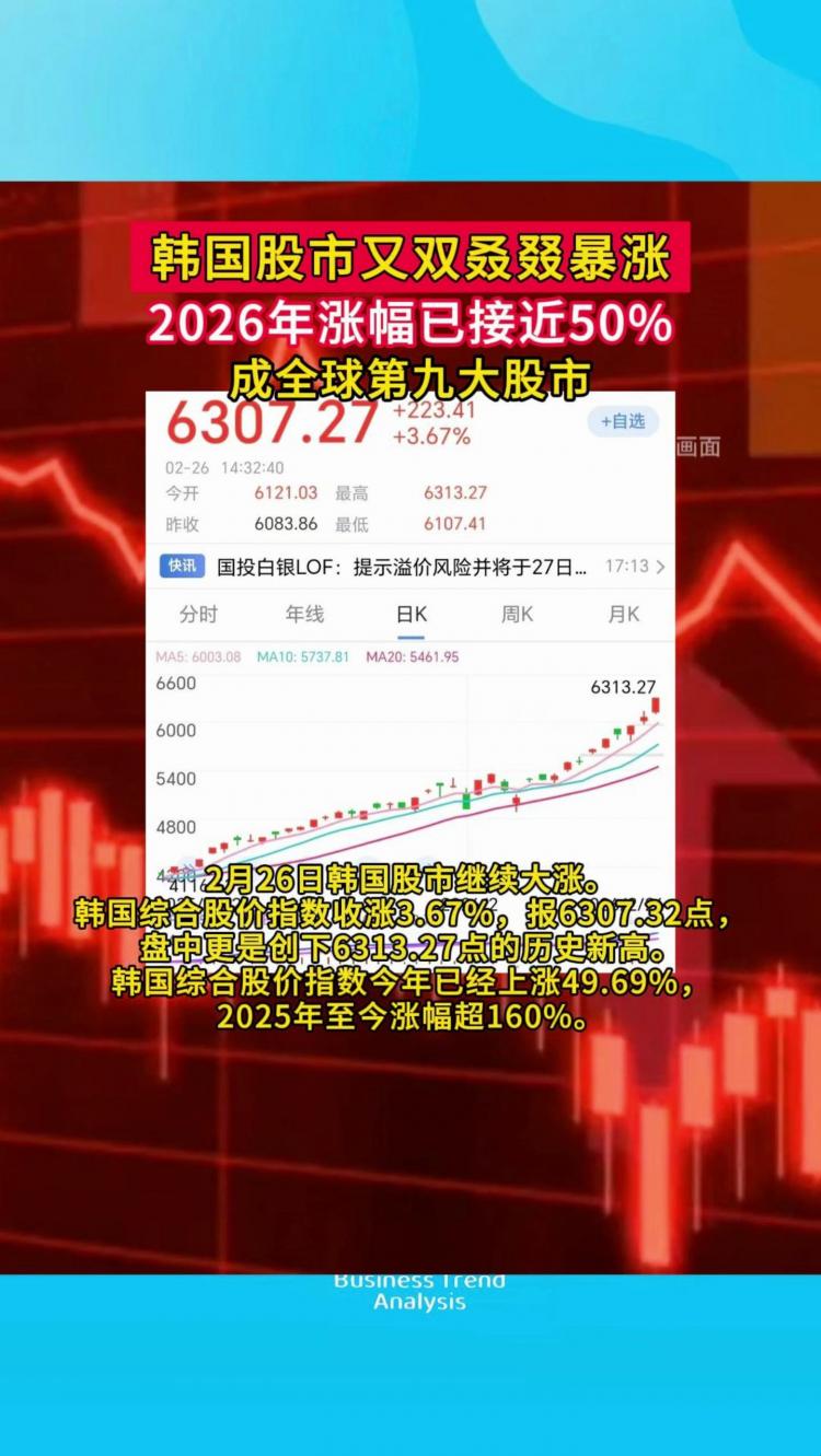 韩国股市2026年涨幅已接近50%,成全球第九大股市