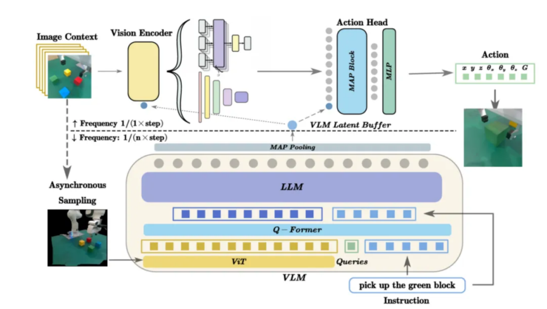 b. 低层次控制系统:采用40M参数的紧凑型视觉驱动动作策略的Transformer网络,处理短期场景认知,融合历史观测与视觉语言模型的潜在特征。