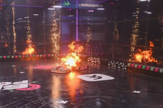 后续中国队对阵俄罗斯老牌强队Webber(其机器人是110kg级的强力弹射型)。深海鲨鱼顶住了对方的正面冲击,并在一次近身缠斗中精准命中对方底盘边缘,直接将对方机器人掀翻并造成内部起火,再次以KO方式挺进四强。