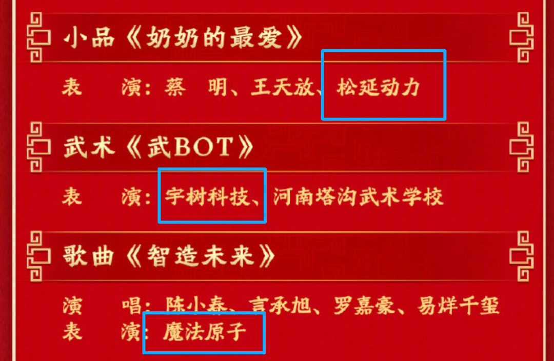 节目单显示,松延动力、宇树科技、魔法原子三家具身智能机器人公司将登上表演舞台。