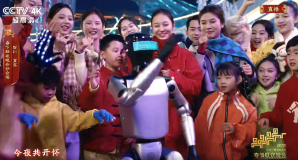 同时,上百台“机器熊猫”在宜宾城市地标广场踏着节拍入场,完成毫秒级同步的列阵与群舞;主会场内,人形机器人伴随着《智造未来》的旋律,与易烊千玺、言承旭等艺人同台共舞,精准完成快速转向、跃动衔接;展示环节,另一台机器人更是完成了托马斯360°回旋、侧空翻等一系列高难度动作。