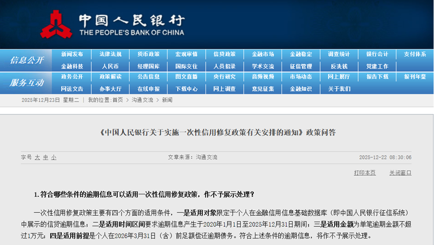 12月22日,中国人民银行正式发布《关于实施一次性信用修复政策有关安排的通知》,以明确的操作规范,为信用受损但积极履约的个人提供了信用修复的路径。