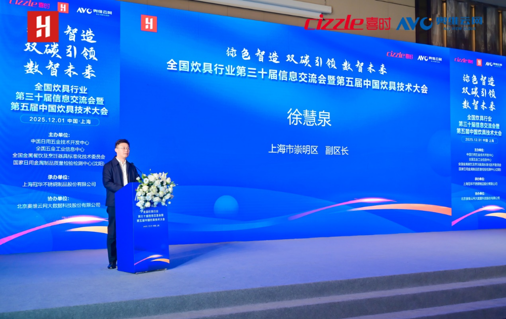 上海市崇明区副区长徐慧泉代表区政府致辞,对大会召开表示热烈祝贺。他指出,轻工厨具是崇明“1+3+X”先进制造业体系的重要组成部分,已培育多家优秀企业。崇明通过政策扶持构建良好政企关系,“十五五”规划之际,诚挚邀请企业家在人才培养、技术创新等领域合作,共享发展机遇。