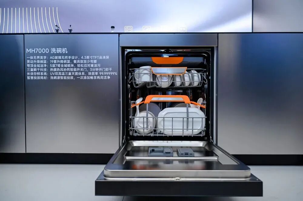 比如升降碗篮洗碗机MH7000,首创19套灵动升降碗篮,彻底解决用户取放餐具的“弯腰之痛”;烟机则配备智能巡航增压功能,无惧楼层压力,自动调节风量,30m³/min风量从容应对中式烹饪,让烹饪者不用分心操作,真正实现“厨电懂人”。
