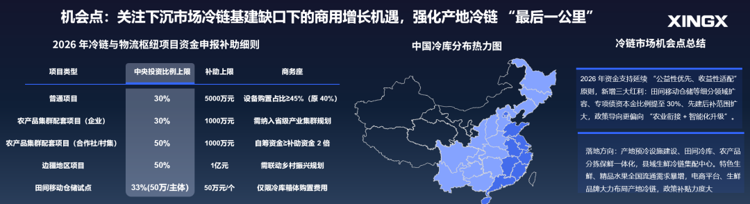 在政策强力托底的背景下,下沉市场冷链基建缺口已成为商用制冷领域的核心增长引擎。2026 年国家延续公益性优先、收益性适配的资金支持原则,针对冷链与物流枢纽项目出台梯度化补助细则,万亿级资金池持续向基建补短板倾斜。目前,中西部县域等下沉市场仍存在显著基建短板,产地冷链最后一公里建设需求迫切。落地方向明确聚焦产地预冷设施、田间冷库、县域生鲜冷链集配中心等核心环节;叠加特色生鲜、精品水果全国流通需求激增,电商与生鲜品牌加速布局产地冷链。多重利好共振下,商用制冷行业已迎来确定性增长机遇。