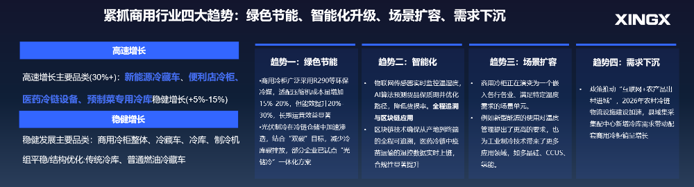 商用制冷产业正围绕绿色节能、智能升级、场景扩容、需求下沉四大主线加速迭代升级。绿色节能领域,R290 环保冷媒、光伏制冷等技术加快普及应用,在能效提升与低碳发展目标下释放长期价值;智能化方面,物联网监控、AI 算法优化、区块链全程溯源等技术深度渗透,尤其在医药冷链场景显著提升运营效率与合规水平;场景扩容上,商用冷柜持续向多行业定制化场景延伸,新能源、半导体、氢能等新兴领域也为工业制冷打开全新增量空间。整体而言,行业正依托技术升级与市场下沉实现结构性增长,高增长赛道与稳健品类协同发力,为商用制冷企业带来多元化的发展机遇。